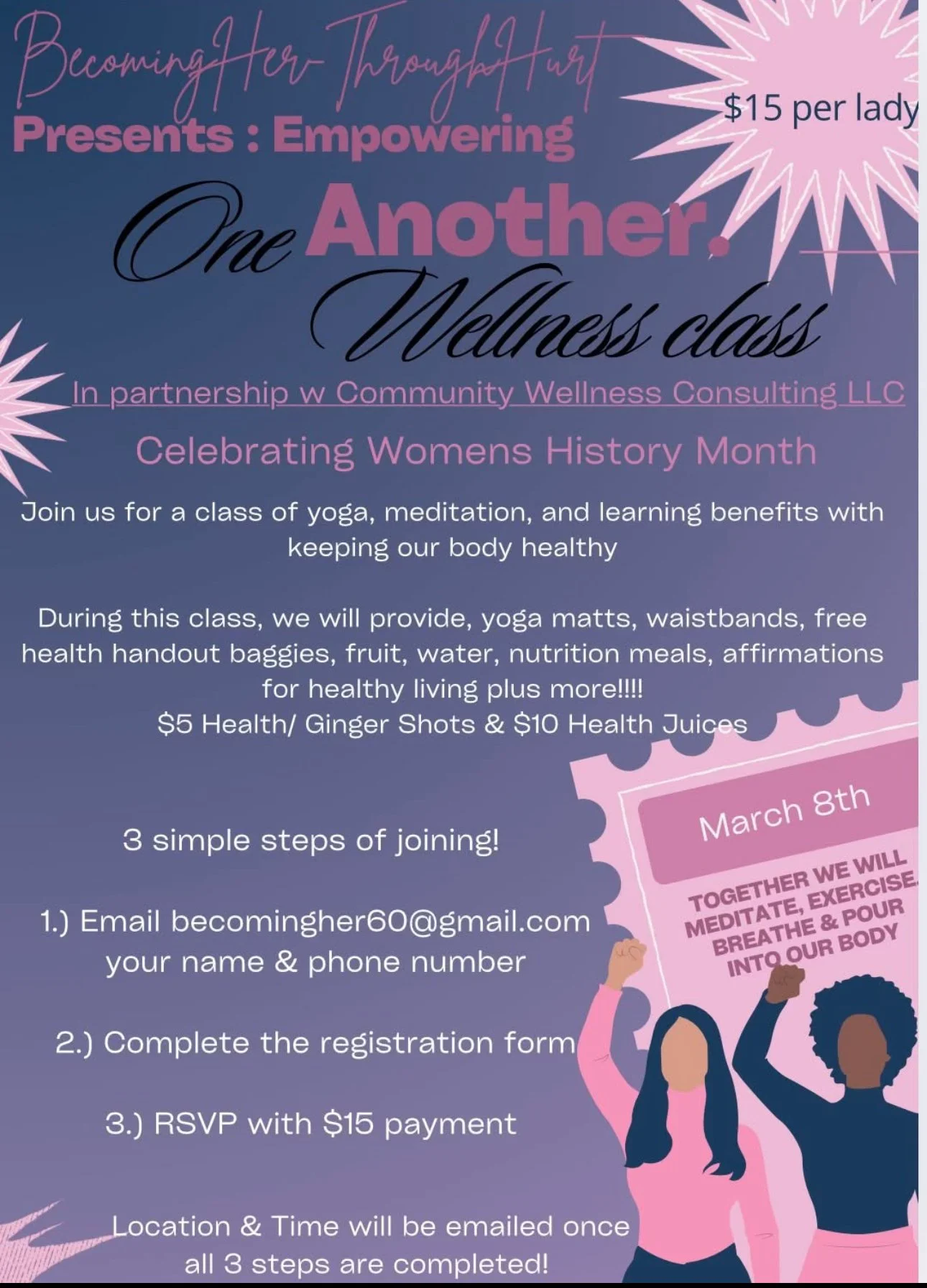During this class, we will provide, yoga matts, waistbands, free health handout baggies, fruit, water, nutrition meals, affirmations for healthy living plus more!!!!